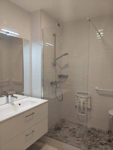 Batiment C, un appartement en rez de jardin de 51.50m², comprenant une cuisine équipée ( plaque, hotte, frigo et lave vaisselle) et aménagée ouverte sur séjour, une chambre, une salle de bains avec WC, un cellier et un dressing.