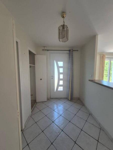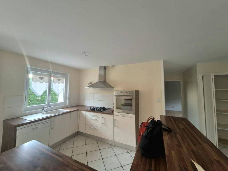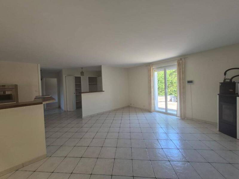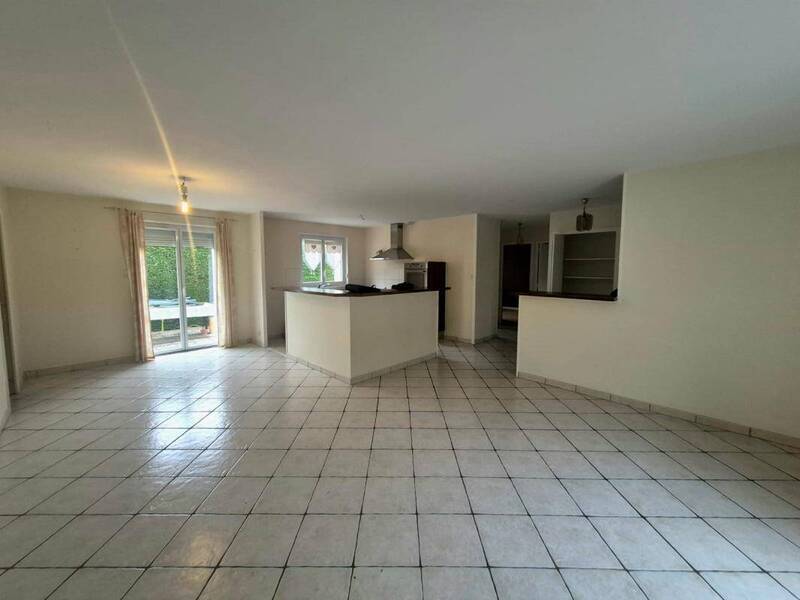 Maison plein pied d'environ 80m², comprenant une entrée avec placard, une cuisine aménagée et équipée (plaque, four, hotte), ouverte sur le séjour.